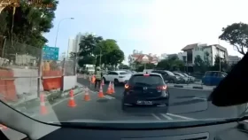 Во время строительных работ вода подмыла основание дороги вследствие чего образовалась огромная воронка под дорожным полотном. Пересечение улиц Танджонг Катонг и Маунтбаттен, Сингапур.
