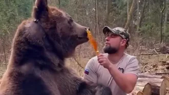 Забавно, что медведи, которых держат в качестве домашних питомцев, очень похожи на гигантских кошек. Этот медведь даже целует этого мужика в благодарность за угощение. Но только вот когда кошка