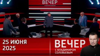 «Вечер» — эфир и запись видео от 25 июня 2025. Ведущий: Владимир Соловьев. В выпуске: На саммите НАТО в Гааге Трамп сравнил конфликт на Ближнем Востоке с дракой школьников.